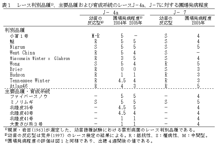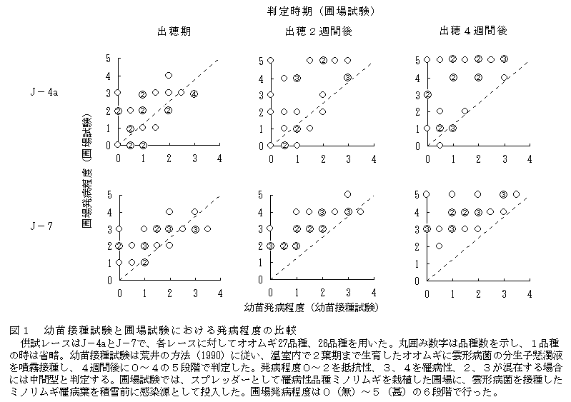 オオムギ雲形病では、レースにかかわらず、幼苗接種試験で抵抗性と判定された品種の多くが、圃場試験で出穂期以降に著しく発病する。このため、抵抗性品種育成のための評価は圃場試験を主体に行う必要がある。 |