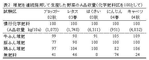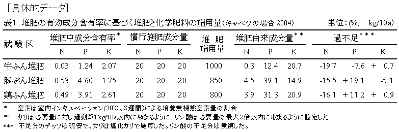 家畜ふん堆肥を露地野菜栽培で連用すると、通常化学肥料で施用するリン酸、またはカリの施用量を、堆肥の成分で代替でき、リン酸、カリの化学肥料削減が可能である。ただし、窒素が不足するので、必ず不足量を単肥の化学肥料で施用する。 |