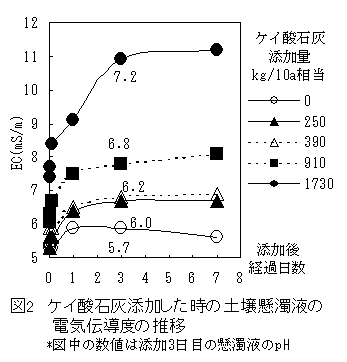 ケイ酸石灰200kg/10a程度を施用してから2週間以内に代かきをすることで、ECが上昇して懸濁物質(SS)の沈降が早まり、代かき時に発生する懸濁物質のほ場からの排出を抑制し、水質汚濁を低減できる。 |