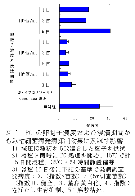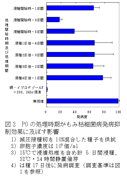 保菌種子を浸種開始と同時に3日間、105個/mlの濃度に調整したPythium oligandrum MMR2株の卵胞子懸濁液に浸漬処理することにより、イネ育苗期のもみ枯細菌病、苗立枯細菌病の発病が抑制される。 |