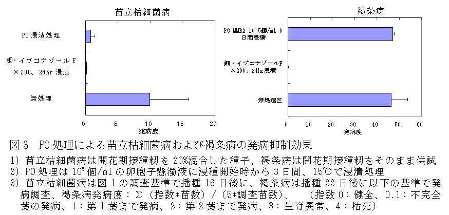 水稲の育苗期に発生する細菌性病害の防除には化学合成農薬による種子消毒が行われているが、薬剤耐性菌の発生や種子消毒廃液の処理の問題等から、拮抗微生物を利用した生物防除が注目されている。そこで、広範囲の病害防除への利用が期待される拮抗微生物(Pythium oligandrum)について、細菌性病害における利用の可能性を明らかにする |