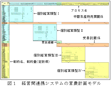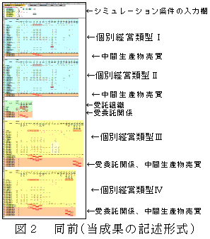 図2の形式で記述された計画モデルは、図1のような通常の単体表の形式で記述された計画モデルとしてXLPにより解釈され、線形計画法、目標計画法及び整数計画法の最適解が計算される。計算結果から、作業受委託や生産物の売買、中間生産物の交換等が各個別経営に及ぼす経済効果、経営条件変化の経営間連携への影響等を解明することができる。 |