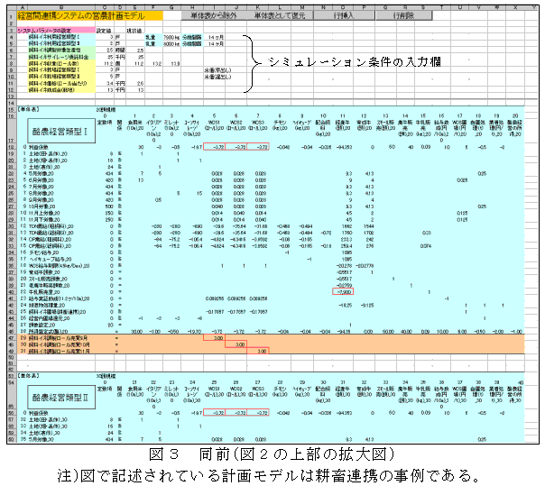 計画モデル(図3)の上部には、単位当たり生産量、作業能率等の技術水準、受委託料金、生産物価格、共同作業上限、助成金の額等の経営条件、各営農類型の戸数等の入力欄が配置されており、シミュレーション分析に必要な条件が設定される。 |