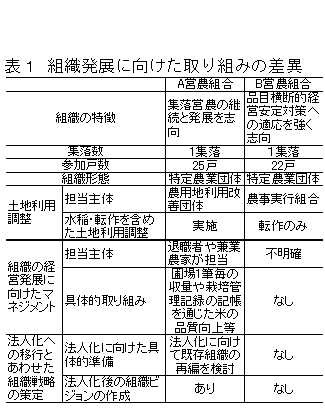 担い手対策下における集落営農の発展のためには、1)面的な農地利用を実施できる農用地利用改善団体等の土地利用調整組織の形成、2)組織のマネジメントを推進する能力のある人材の確保、3)明確な組織戦略の策定のもとでの法人化を通じた経営としての性格を持つ組織への移行、が重要となる(表1)。 |