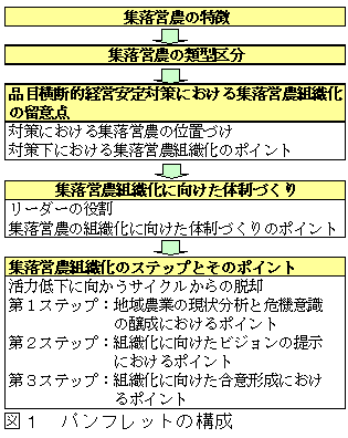 品目横断的経営安定対策下における集落営農組織化の推進に当たっては、農地利用調整組織の形成、組織マネジメントを推進する人材確保、法人化に向けた組織戦略の策定が重要となる。それら組織化を推進する上での留意点を整理したパンフレットを作成した。 |