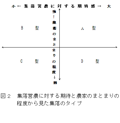 内部リーダと外部リーダーの集落営農組織化に向けた関与のあり方は、図2に示す集 落のタイプによって異なる。A型では、組織作りは内部リーダーを中心に実施し、外部リーダーは支援的役割を担うことが求められる。B型とD型では、両者の相互協力が重要であり、特に、集落営農への期待感の小さいB型では、先進地視察等を通じて組織化効果を農家に実感させることが、一方、地域のまとまりの程度が弱いD型では、農家の協働意識を引き出すことが有効となる。C型では、内部リーダーが中心となって組織化を進めると、集落内からの反発が起きやすいことから、外部リーダー主体に組織化を推進し、地域条件に応じてB、D型の方向に誘導していくことが重要になる。 |