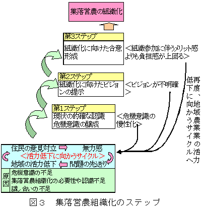 担い手対策下での集落営農組織化の推進方策には3つのステップがある(図3)。各ステップにおいては、1)地域農業の現状認識に基づく「危機意識の醸成」とあわせて「組織化に対する不安の除去」(第1ステップ)、2)「組織化の必要性についての分かりやすい説明」と「目指すべき組織の仕組みの目に見える形での提示」を通じた、「農家の組織化に対する希望の具体化」(第2ステップ)、3)組織化ビジョンをもとに、「組織化に伴うプラスの効果だけでなくマイナスの効果の説明」とともに、「短期間での合意形成」と「すべての参加者が平等に発言できる機会の提示」(第3ステップ)が重要となる。 |