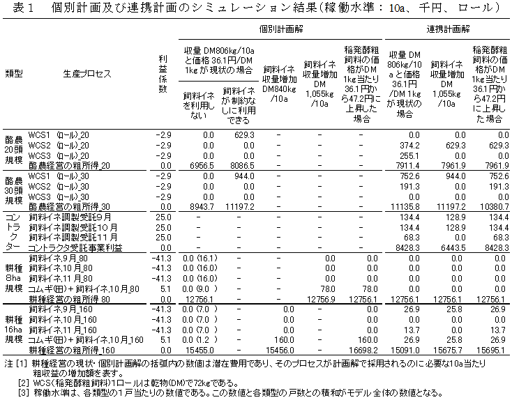 個別モデルによると、酪農経営における稲発酵粗飼料の利用の経済効果は大きい。稲発酵粗飼料を利用しない場合と利用する場合の粗所得(粗収益-変動費)を比較すると、20頭規模の経営では113万円、30頭規模の経営では225万円の増加である(表1の個別計画解)。一方、耕種経営では、現状の飼料イネの生産性のもとでは、小麦、大豆並みの転作助成金に加え、耕畜連携の助成があるにもかかわらず、飼料イネ生産を採用しない。飼料イネ生産が耕種経営の2類型で採用されるためには、水田経営面積10a当たり粗収益が9千円ほど向上する必要がある(表1の注[1])。 |