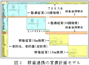 埼玉県米麦二毛作地域を対象に、耕種経営、酪農経営及びコントラクターの個別営農計画モデル、並びにそれらを統合した、耕畜連携(図1)を組み込んだ営農計画モデル(図2)を作成して、稲発酵粗飼料の生産と利用の経済効果、耕畜連携が各経営に及ぼす効果を計測した。酪農経営は経産牛頭数規模により20頭規模と30頭規模の2類型、耕種経営は水田経営面積規模により8ha規模と16ha規模の2類型を設定した。 |