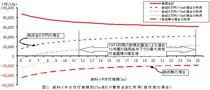 大規模水田作経営(経営耕地60ha程度)が専用収穫機(フレール型)1式を保有してイネWCS生産を行う場合、20ha前後の栽培が可能であり、10a当たり費用合計は6万円程度にまで低減できる。麦・大豆並の助成金が交付されるならば、麦・大豆単収の低い地域(県平均以下)でイネWCS生産の導入される可能性が高まる。 |