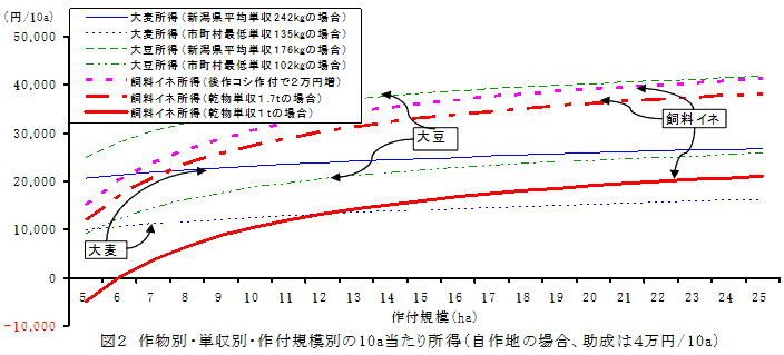 飼料イネが導入されるには、同じ転作作物である麦・大豆並の収益性が確保される必要がある。麦・大豆と同等の助成金が得られる場合、20ha前後の作付規模で単収1tの飼料イネの10a当たり所得は、表1のモデル経営が新潟県市町村の麦・大豆最低単収を実現した場合の麦・大豆作所得に近い(図2)(この場合の1日当たり所得は飼料イネ2万円、大麦3.6万円、大豆2.1万円)。しかし、新潟県5ヶ年平均の大豆単収(176kg)の10a当たり所得に接近するには、1.7t以上の飼料イネ単収が必要である。
