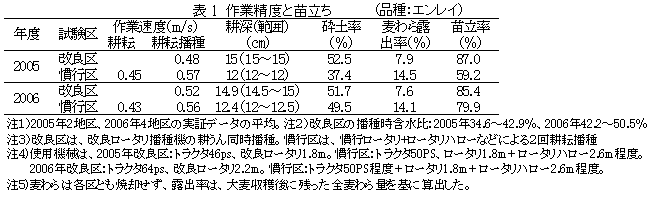 改良ロータリ播種栽培は、麦わらを焼却しないまま時速1.8km程度の1回の耕うんで耕深15cm程度を確保でき、麦わらのすき込み性、砕土性は慣行播種体系より良好となるなど、慣行播種栽培に比べて精度の高い播種が可能である(表1)。 |