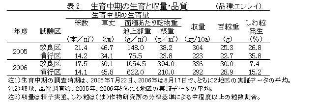 この結果、慣行播種栽培に比べて、苗立ちが安定し株数が確保され、地上部や根の生育が促進され、百粒重も重く、しわ粒が少なくなり、品質・収量が向上する(表2)。 |