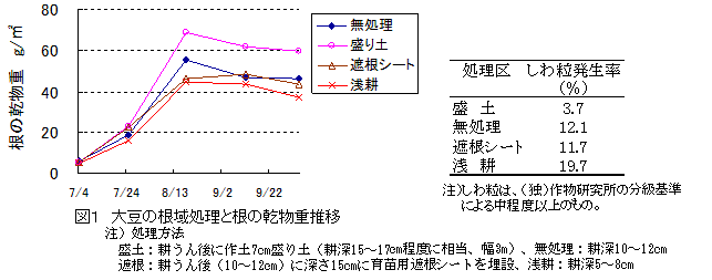 大豆の播種時の深耕(15~17cm)は、浅耕(5~8cm)や標準耕(10~12cm)や遮根処理に比べて地上部、地下部(根)の生育が旺盛になり、しわ粒の発生も少ない(図1)。 |
