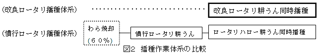 改良ロータリを用いた耕うん同時播種栽培(以下、改良ロータリ播種栽培という)は、2回耕うんまたは砕土する(ロータリ+ロータリハローなど)慣行の播種栽培(以下、慣行播種栽培という)に比べて、耕うん作業が1回省かれるため省力的である(図2)。 |