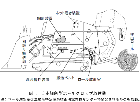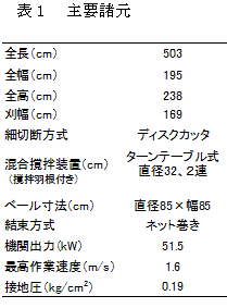 開発した自走式の細断型飼料イネ専用収穫機の概要を図1及び表1に示す。5条刈り自脱コンバインの台車前方に刈取り部と搬送装置を備え、その後方に、ディスクカッタ(直径、切断刃20.5cm、送り刃17.5cm)を切断間隔1.5cmに組み込んだ細断装置を配置している。細断された穂先と株元は落下して、撹拌装置により籾と茎葉は混合され、搬送ベルトでロール成形室に送り梱包する。細断した収穫物を迅速かつ確実に結束できるようネット巻き装置を装備している。 |