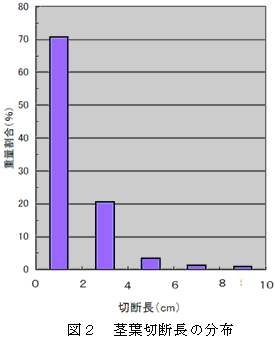 細断後の飼料イネ茎葉の切断長分布は、切断長2cm以下が約70%、2cm~4cmが約20%で、4cm以下が90%の高い割合となり、細断装置は有効に機能している(図2)。収穫時の作業能率は0.3~0.45ha/時(ロールベール8個/10a)である。 |