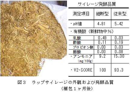 乾物梱包密度は、156~166kg/m3であり、自脱コンバイン型およびフレール型専用収穫機より10~30%高い。収穫の約1ヶ月後に開封したラップサイレージは外観が良好であり、従来の自脱コンバイン型専用収穫機で調製したものよりも品質がよい(図3)。