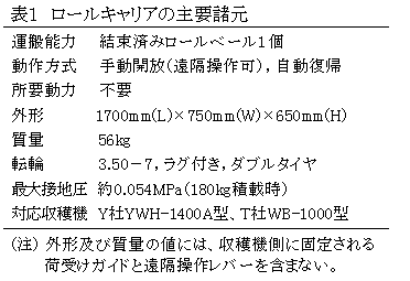ロールキャリア(表1)は、専用収穫機が刈り取り成形作業を行いながら、排出した成形・結束済みロールベール1個を運搬して、任意の位置に荷降ろしできる運搬装置である。油圧等の外部動力を必要とせず軽量かつ簡易な構造であるとともに、作業中でも停車せずにワンタッチで荷降ろしができ高い作業性を有する。 |