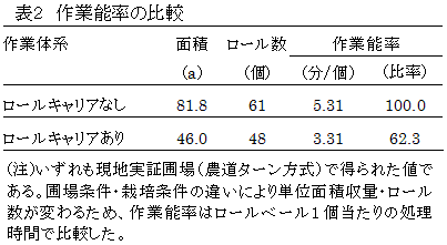 大区画圃場で自走式ベールラッパ1台と組み合わせて作業する場合、本装置の使用により、圃場内での作業全体の能率を最大35%程度向上できる(表2)。 |