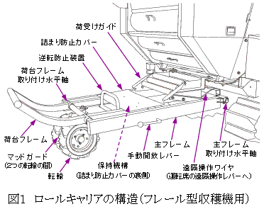 本装置は、主フレーム、転輪、荷受けガイド、荷台フレーム、保持機構及び遠隔操作レバー等で構成される(図1)。主フレームは主フレーム取り付け水平軸により専用収穫機に装着され、首振り自在な転輪と組み合わせて、旋回時でも専用収穫機に対して適正な位置に保たれる。 |