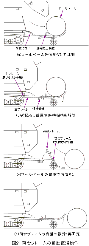 荷台フレームは荷台フレーム取り付け水平軸回りに回転できる構造で、通常時は保持機構により固定されている。荷降ろし時は、手動開放レバー又は運転席にある遠隔操作レバーを操作して保持機構を解除すれば、ロールベール自重により荷台フレームが後方に倒れて荷降ろしされる。荷台フレームの重心位置はこの水平軸より前方であるため、荷降ろし後は自重により自動復帰し、保持機構のラッチにより再び固定される(図2)。 |