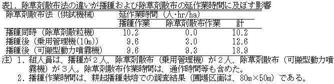 本機を使用した播種作業時間は、除草剤の補給時間がかかるため慣行よりも6%程度多く要するが、播種から除草剤散布にかかわる総作業時間は、慣行よりも短縮できる(表1)。 |