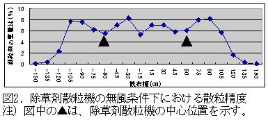 本機を播種機の後方に2機取り付けることで、散布幅1.8mに概ね均一に細粒剤を散布できる(図2)。 |