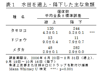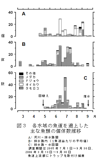 タモロコは5~7月に排水路内を活発に移動し(図3)、水田を繁殖と成育の場所として利用する(表1)。また、メダカも水田で繁殖する(表1)。オイカワは河川から排水路に盛んに遡上するが、水田へ遡上しない(図3)。 |