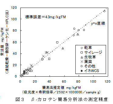 粗飼料・葉菜中β-カロテン含量は、ミキサー抽出-アセトニトリル洗浄-吸光度測定により簡易迅速に推定できる。 | ||||||||