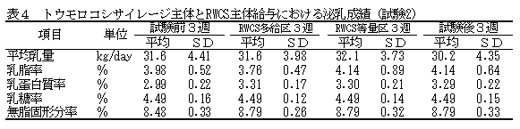 泌乳中後期牛(平均分娩後日数124.7)を用いた試験2では、乾物摂取量に差がなく、TDN充足率も100%以上を維持する(表2)。乳脂率でRWCS多給区がやや低い傾向にあるが、その他の乳成分、乳量は両区に差がない。また、試験前後の慣行飼養(トウモロコシサイレージ主体給与)との比較においても両区とも乳量に差がなく(表4)、トウモロコシサイレージを確保する必要性に応じて稲発酵粗飼料主体の給与が選択可能である。 |
