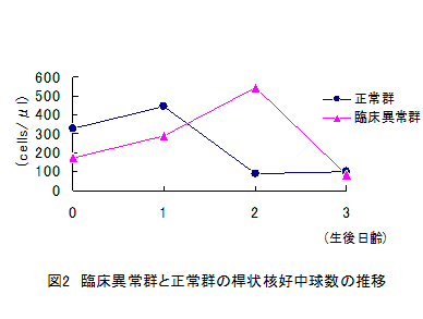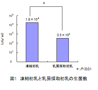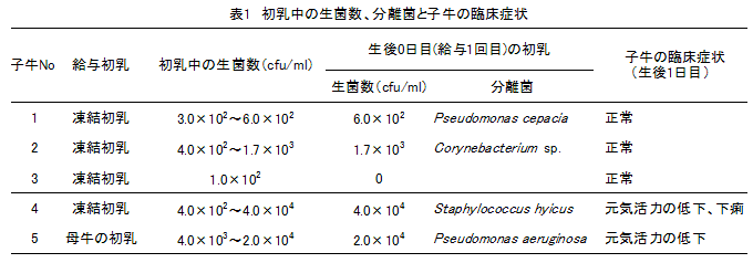 酪農家で凍結保存されたウシ初乳は、乳房から採取した初乳に比べて一般細菌の検出率が高く、生菌数も多いが、全初乳検体とも60℃30分加熱によって細菌は検出されなくなる。また、給与した初乳中の生菌数が1.0×104cfu/mlを越えると、子牛の桿状核好中球数が増加し、活力低下等の症状が発現する。 | ||||