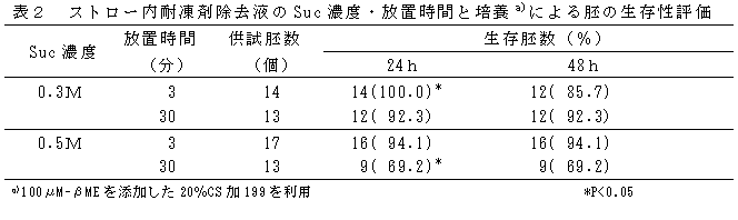 クライオトップ(CT)を用いてガラス化保存したウシバイオプシー胚は、耐凍剤除去液を入れたストロー内にCTシート部を挿入、上下に振とうして、胚をストロー内に移行させることで、耐凍剤除去が可能である。0.3モル(M)Sucrose(Suc)を添加した20%子牛血清(CS)加199を耐凍剤除去液とした場合の受胎率は定法と同等である。 | ||||||
