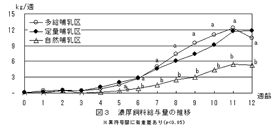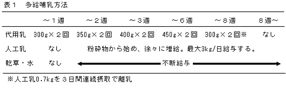12週齢までの下痢の発生回数は、定量哺乳区でのべ8頭、多給哺乳区で4頭であり、哺乳量に関係しない。 |