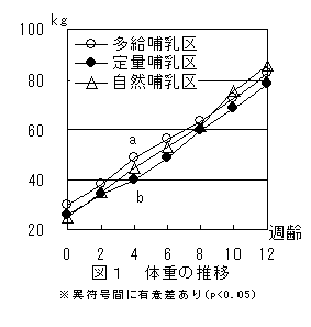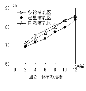 多給哺乳区は、8週齢時までは自然哺乳区と同等の体重増加や体高の伸びを示す(図1、2)。また、定量哺乳区に比べ生後4~6週間の発育が優れている。 |