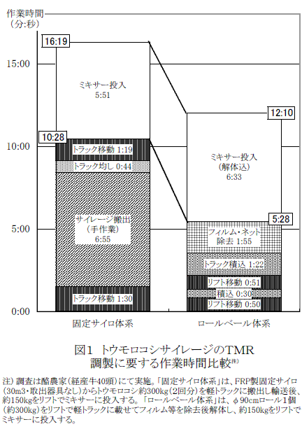 細断型ロールベールサイレージのTMR調製の作業性と泌乳牛への給与指標 | ||||||
