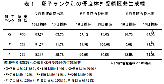 | 1.成熟前の卵子の形態は、優良な体外受精胚に発生後の脱出率に影響しない(表1)。 |