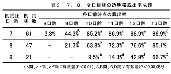| 3.9日目胚の透明帯脱出率は低い(表2)。 |