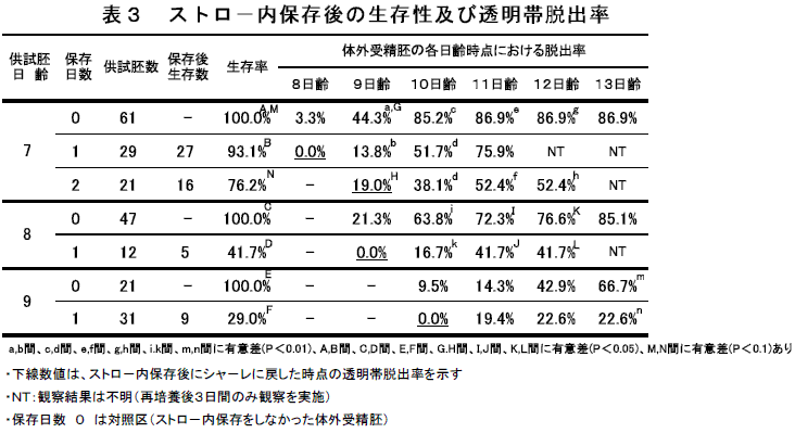| 5.ストロ-内保存は、透明帯脱出率を低下させる(表3)。 |