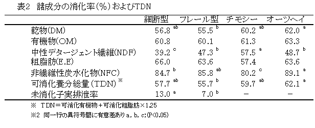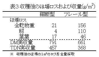 自走式細断型ロールベーラで収穫した稲発酵粗飼料は、市販フレール型専用収穫機で収穫したものに比べ、子実割合が高いことによって、繊維、粗灰分、ケイ酸含量が少なく、非繊維性炭水化物含量が高い。また、前者は後者に比べ繊維の消化率が劣るものの、エネルギー価に差はなく、圃場ロスが少ないため、単位面積当たりのTDN収量が高い。 | ||||||||