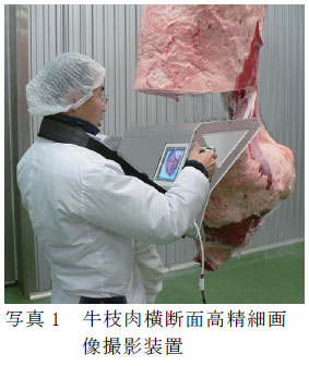 牛肉を牛枝肉横断面の高精細画像撮影装置(ミラー式)(早坂理工、HK333)を用いて撮影する。本機器は、高解像度(1,000万画素程度)のデジタルカメラを内蔵し、光学測定用ライン型LEDを利用した照明などにより鉛直方向から一定距離で鮮明に牛枝肉横断面を撮影することが可能であり、1頭当たりの撮影及び画像のメディアへの記録時間は30秒程度である(写真1)。 |