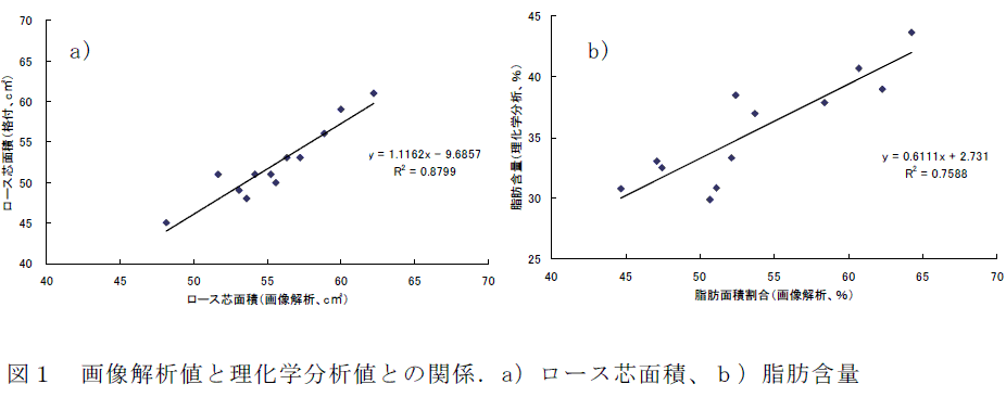 撮影された画像から画像解析を用いて算出されたロース芯面積と(社)日本食肉格付協会の格付員による格付値との間には統計的に有意な正の相関が認められ、画像解析方法を用いることでロース芯面積を測定することができる(図1a)。 |