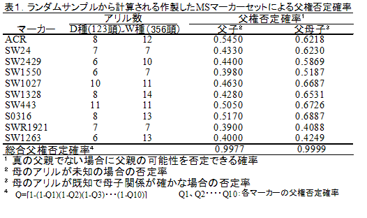 父子関係のある組合せ(D種18頭、LWD35頭)において父子判定を実施し、すべての組合せにおいて父が特定でき交配記録に間違いはないことを確認している(表3)。 |
