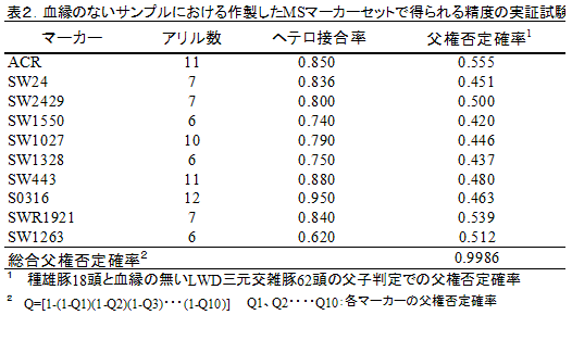 選定マーカーを使った実証試験において4戸の農家由来のサンプル(LWD交雑豚62頭、D種18頭)を使って父子判定をしたところ各マーカーの父権否定確率は0.555から0.420であり、10マーカーの総合父権否定確率は0.9986と計算される。実際には1116組のうち1113組で父子関係が否定(1113/1116=0.9973)されている(表2)。 |