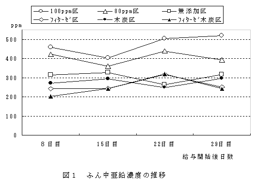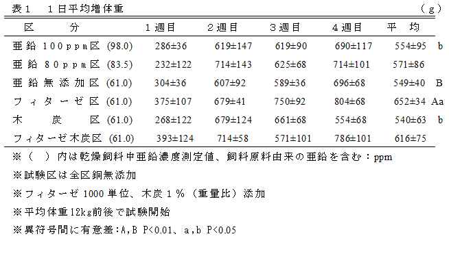 木炭の飼料添加により、ふん中亜鉛濃度は低下したが、生産性に影響は見られなかった。 |