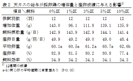 天カスの混合割合が増加するに従って、産卵率および産卵日量は低下傾向を示す。天カス10%区は、0%区に比して産卵率が5.5ポイント低下するが、卵重が有意に増加し、飼料効率には差がない(表2)。 |