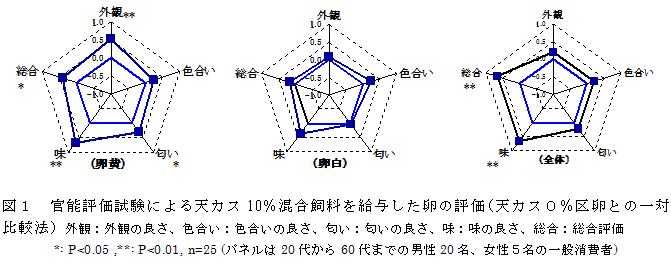 ゆで卵を用いた消費者型官能評価における天カス10%区を0%区と比較した場合の評価値は、全ての評価項目で天カス10%区の成績が0%区を上回り、特に卵黄では外観の良さ、匂いの良さ、味の良さおよび総合評価に有意差が認められる(図1)。天カスを混合給与することによって消費者における卵の嗜好性が向上する。 |