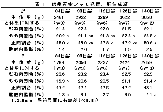 「シャモ833系」を父鶏、「名古屋種」を母鶏とする交雑種「信州黄金シャモ」の126日齢平均生体重は、雄3.6kg、雌2.4kg、雄雌平均3.0kgである(表1)。 |