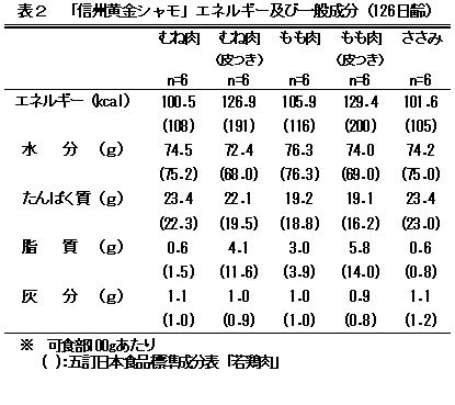 信州黄金シャモの産肉成績は、126日齢の雄雌平均生体重3.0kg、と体重に対する正肉割合は47.2%である。可食部100gあたりのもも肉のエネルギー含量は129kcalと一般的なもも肉よりも低く、官能評価では弾力性のある肉と評価されている。 |