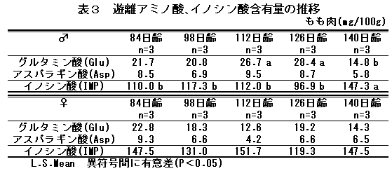 126日齢もも肉の遊離アミノ酸含有量は、雄はグルタミン酸28.4mg/100g、アスパラギン酸8.7mg/100g、雌はグルタミン酸19.2mg/100g、アスパラギン酸6.6mg/100g、126日齢もも肉のイノシン酸含有量は、雄は96.9mg/100g、雌は119.3mg/100gである(表3)。 |